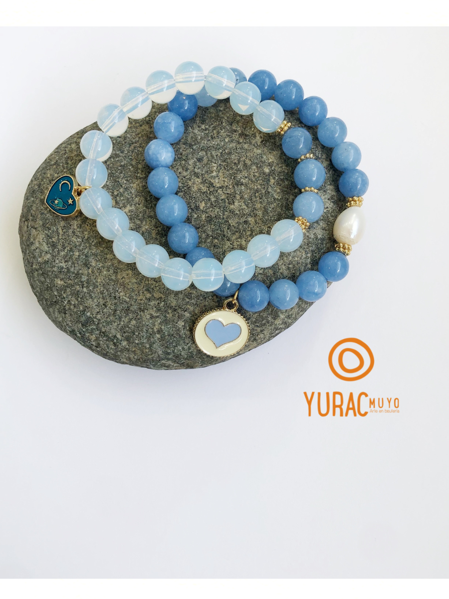 Pulseras con piedras luna azul, aventura azul y piedra de rio con dijes corazón